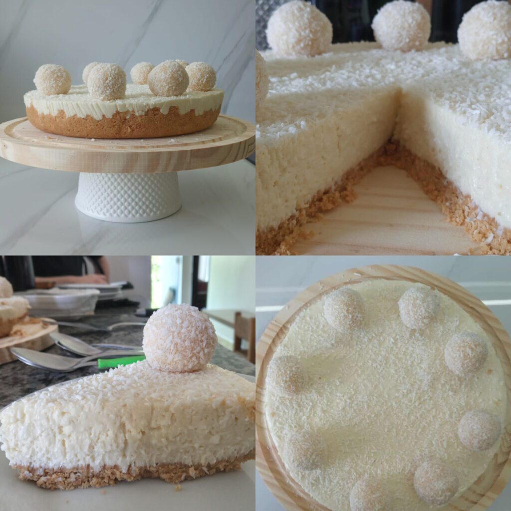 3- Por fim, finalize com o restante do coco ralado por cima de toda a torta e acrescente os Raffaelos ou os beijinhos.
